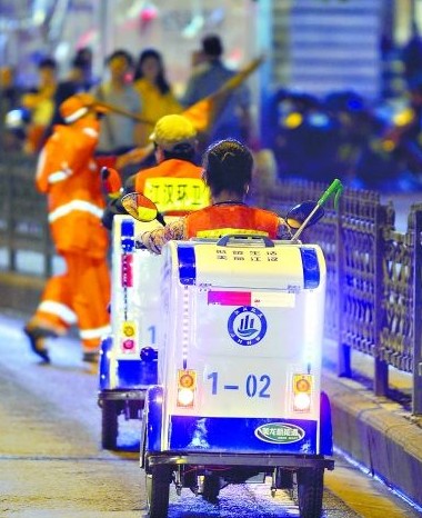 近幾日晚上,江漢城管清掃一隊環衛工朱師傅都騎著電瓶車,在大洋百貨廣場撿拾廢棄物。車還是那輛車,但尾部多了兩豎條共20個彩燈在閃爍。 據介紹,過去即使在路燈下,也要60-70米才能看見電瓶車,安裝警示燈后,200米開外就能看到,大大提高環衛工作業安全,且成本僅60元。清掃一隊共有5輛電動環衛保潔車加裝了警示燈,如果效果好,將在全區150輛電動環衛保潔車上推廣。市城管委相關負責人表示,全市目前約有800多輛這種電動保潔車,大大降低了環衛工勞動強度,也提高了保潔效率,加裝夜間發光裝置,江漢區是首創。